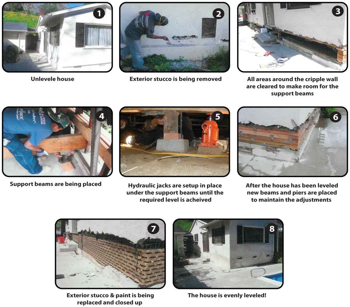 Homeowners should be mindful that in order to level the floors of a home, the side stucco at the bottom perimeter is usually stripped off so the support beams can pass through and the house itself can be adjusted without compromising the rest of the exterior walls. Once the home is evenly raised, the stucco can be placed back and matched to paint, the last touch for any homeowner’s peace of mind.